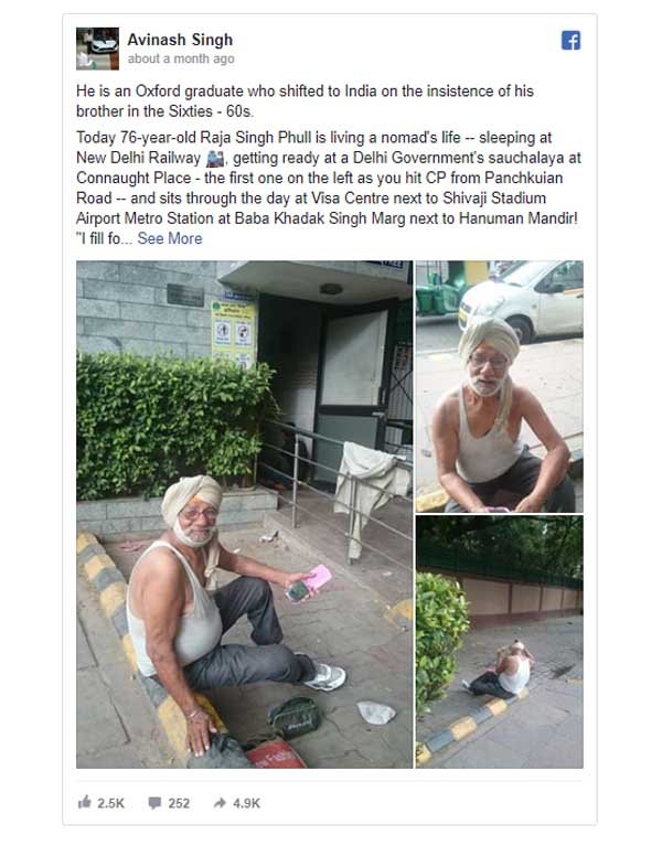 दरअसल दिल्‍ली के रहने वाले अविनाश सिंह ने अपने फेसबुक वाल पर राजा सिंह नाम के इस शख्‍स की कहानी पोस्‍ट की थी.. इस पोस्‍ट के मुताबिक राजा सिंह नाम के बुजुर्ग नई दिल्‍ली रेलवे स्‍टेशन पर कई सालों से खानाबदोश जीवन जी रहे थे। असल में इनके साथ हुआ ये था कि वे अपने भाई के कहने पर 1960 में भारत आए और फिर तभी दोनों भाईयों ने मिलकर मुंबई में मोटर के पुर्जों का बिजनेस शुरू किया, पर कुछ समय बाद भाई की मौत हो गई, जिससे इनका बिजनेस पूरी तरह से ठप हो गया.. वहीं  इनके दोनों बेटों ने भी घर से निकाल दिया।